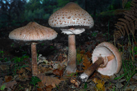 Principali caratteri identificativi: M. procera può essere identificata con una certa facilità, anche da parte dei meno esperti, grazie ai suoi peculiari caratteri macroscopici. Tra questi sono da sottolineare la grande taglia, fino a 40 cm di diametro del cappello e 50 cm di altezza, il cappello decorato da squame in rilievo e più scure del fondo, il gambo legnoso, rigido e fibroso, zebrato da bande nere e dotato in alto di un anello doppio e scorrevole. Il bulbo basale è abbastanza largo e arrotondato, mai marginato. La carne del cappello è bianca immutabile, soffice, senza o con leggero odore fungino e con sapore gradevole, mentre le lamelle sono fitte, bianche, a volte con leggera sfumatura rosa. In caso di abbondante pioggia può essere raccolta con cappello dilavato, privato delle tipiche squame. Caratteri microscopici: Le basidiospore sono ellissoidali, lisce, ialine (trasparenti), con poro germinativo visibile, misurano in media 14-18 × 8,5-11 µm e sono bianche in massa. Habitat e fenologia: M. procera è estremamente comune e abbondante in tutti i boschi e ambienti prativi, purché il terreno sia sufficientemente concimato. Facile da incontrare in gruppi di numerosissimi esemplari nei pascoli e negli oliveti, dalla pianura alla montagna. È tipicamente autunnale ma in certe annate compare anche in primavera. Commestibilità: M. procera con relativo gruppo è una specie molto apprezzata e consumata in molte zone d’Italia. Deve essere scartato il gambo fibroso e duro, ma il cappello carnoso e soffice risulta adatto per diverse preparazioni e vanta specifiche ricette. A differenza di ciò che viene scritto sui libri divulgativi, in tal senso troppo semplicistici, dobbiamo però raccomandare prudenza, moderandone le dosi, operando una lunga e adeguata cottura ed evitarne il consumo in pasti consecutivi. Le Macrolepiota, infatti, sono specie molto pesanti da digerire per cui è bene non abbuffarsi; inoltre non possono essere conservate per congelamento in quanto presentano la caratteristica di favorire lo sviluppo di sostanze tossiche quando l’acqua contenuta nelle strutture passa allo stato solido. Specie a confronto: In funzione di pochi caratteri, spesso male apprezzabili, dalla M. procera tipo sono state create diverse entità infraspecifiche, talvolta considerate specie autonome, così riassumibili: |